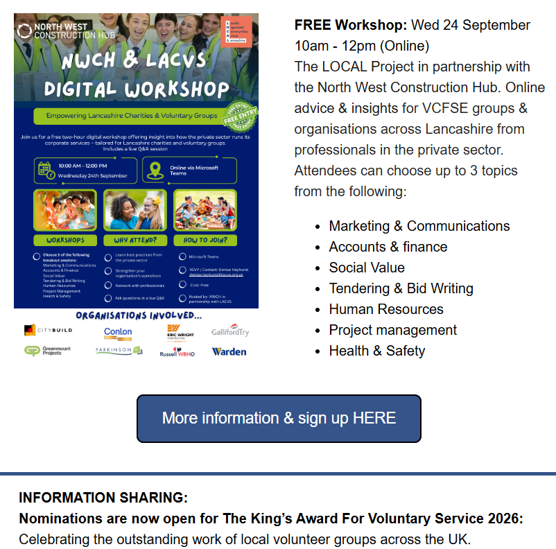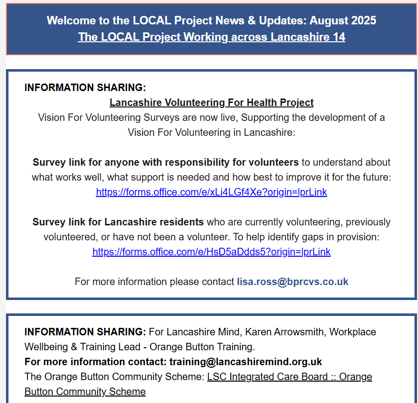 Information sharing | Latest Reports | Webinars & Events | Funding | Lancashire Anti-Poverty Network | Launch of Fylde & Wyre VCFSE Networks | Lancashire Volunteering for Health